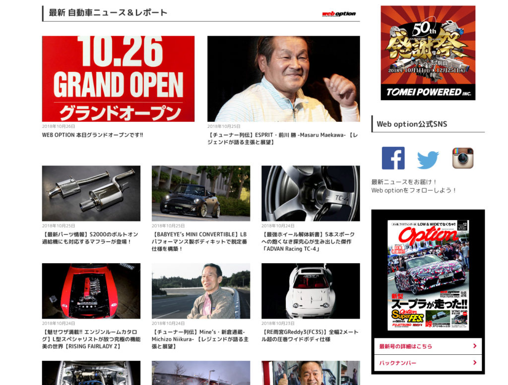 月刊誌「OPTION」は1981年に創刊され、今年500号を迎えた日本最古にしてオンリーワンのチューニングカー雑誌です。チューニングシーンの熱気をよりリアルに、より速くお届けするために、ウェブサイト「WEB OPTION」を開設いたしました。