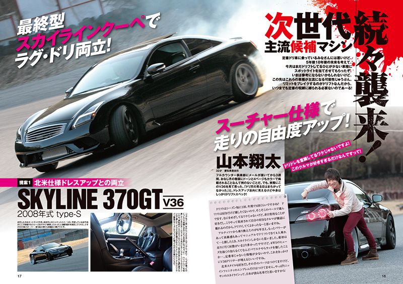 ドリフト天国4月号は、次世代のドリフト主流マシン候補として「フェアレディZ(Z33)」や「スカイライン(V35&36)」、「ミラ(L285)」を強力プッシュ!! また、軽カーやFFノーマルでのドリフトの楽しみ方を紹介する。