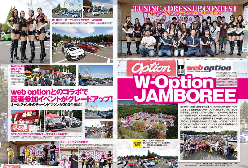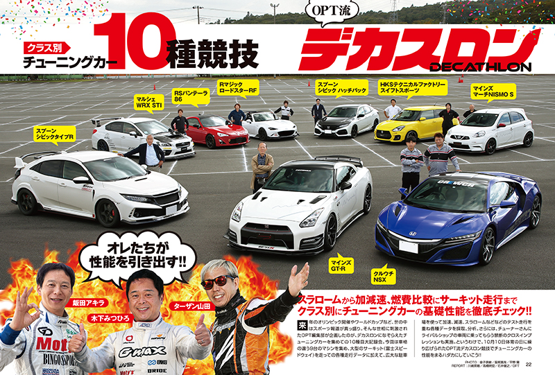 オプション12月号は、ワールドカップ、オリンピックと日本中がスポーツに湧く今、OPT編集部は独自企画『OPT流デカスロン』を特集!! スラロームから加減速、燃費比較のサーキット走行等、クラス別にチューニングカーの基礎性能10種目を徹底チェック!! ドライバーは、飯田アキラ、木下みつひろ、ターザン山田の3人のほか、テスト車両のチューナーたちにライバルショップの車両に乗ってもらう禁断のクロスインプレッションも実施!! ほか、超新型対決『SKYLINE4OOR vs SUPRA RZ』や新連載の『救え!! 放置のポンコツR BCNR33GT-R』も注目!!