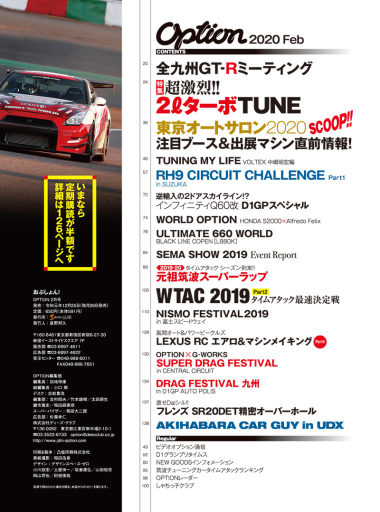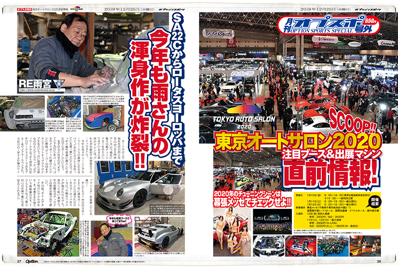 オプション2月号は、毎年恒例、限定ステッカー引換券付き『東京オートサロン2020』直前情報を大公開!! そのほか、世界規模で激戦区となっている2LターボTUNEを特集!! 注目ブースと出典マシン情報をチェックして引換券を持って会場に来てね!!