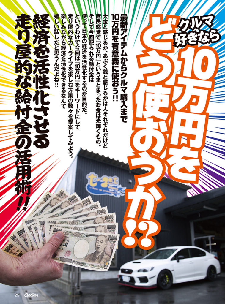 大金と感じるか、あぶく銭と感じるかは人それぞれだけど庶民感覚で「10万円」というまとまったお金は光輝くもの。そして今回配られる給付金は、使って日本の経済を活性化するのが目的だ。というわけで今回は「10万円」をキーワードにして、走り屋的なカーライフを楽しむ方策の数々を提案してみよう。楽しみながら経済を活性化できるなんて嬉しい話しだと思うんだよね!!